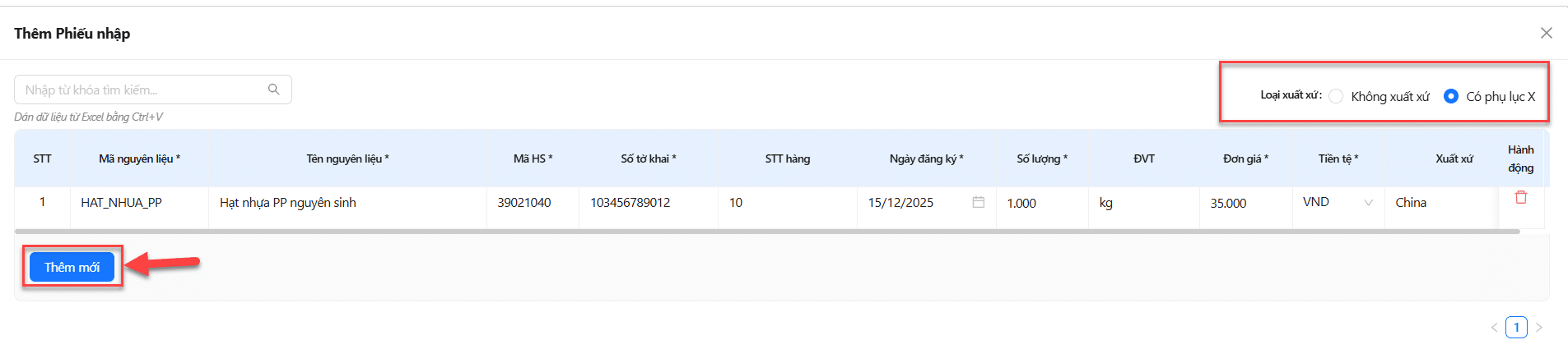 Bước 2: Nhập đầy đủ các thông tin theo form > Chọn loại xuất xứ > Ấn “Thêm mới” để hoàn thành.