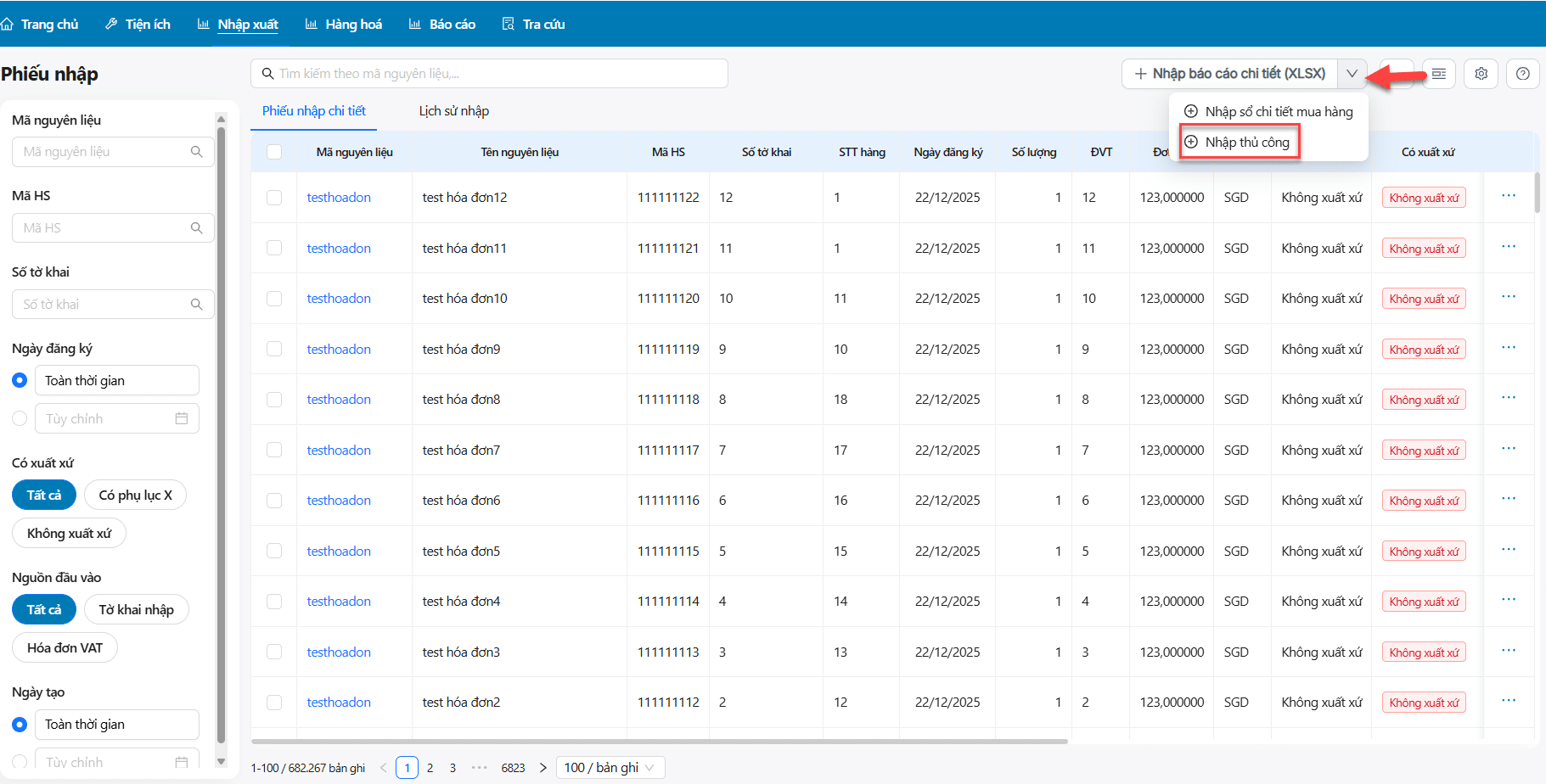 Bước 1: Tại màn hình danh sách Phiếu nhập > Bấm vào nút mũi tên chỉ xuống bên cạnh > Chọn “Nhập thủ công“