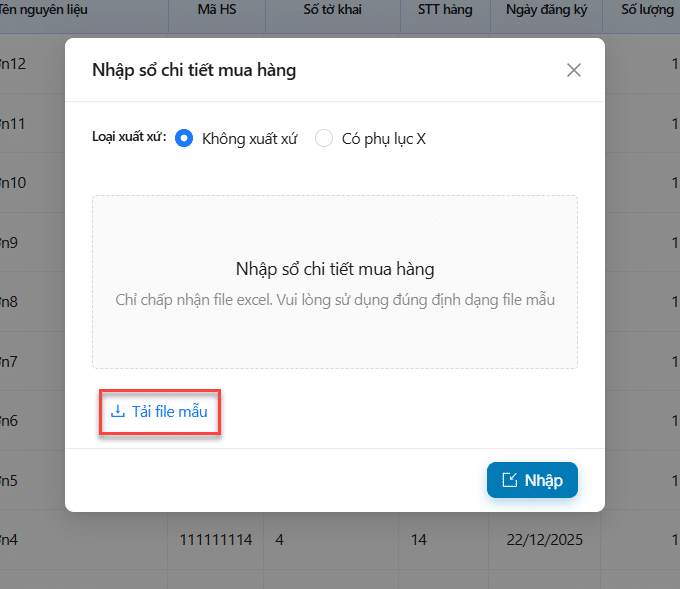 Bước 2: Xuất hiện của sổ “Nhập sổ chi tiết mua hàng” > Nhấn chọn “Tải về file mẫu“