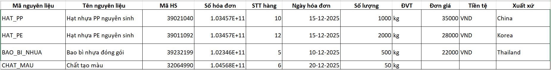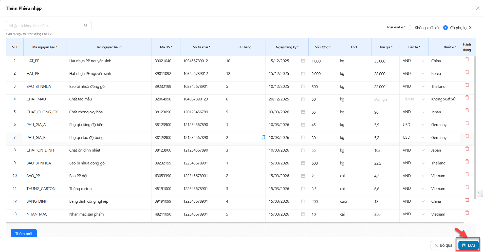 Về bản chất , phiếu nhập giúp doanh nghiệp xác định rõ nguồn gốc của nguyên liệu, bao gồm thông tin hóa đơn, mã HS, số lượng, đơn giá và tình trạng xuất xứ. Toàn bộ dữ liệu này là cơ sở để hệ thống tính toán định mức (BOM), xác định tỷ lệ xuất xứ và đánh giá khả năng đáp ứng quy tắc xuất xứ khi lập hồ sơ C/O.