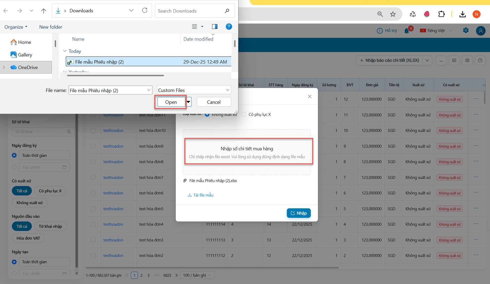 Bước 4: Quay lại màn hình hệ thống > Tích chọn hoặc kéo thả file vừa xử lý vào vùng “Nhập sổ chi tiết mua hàng” > Sau đó ấn “Nhập“