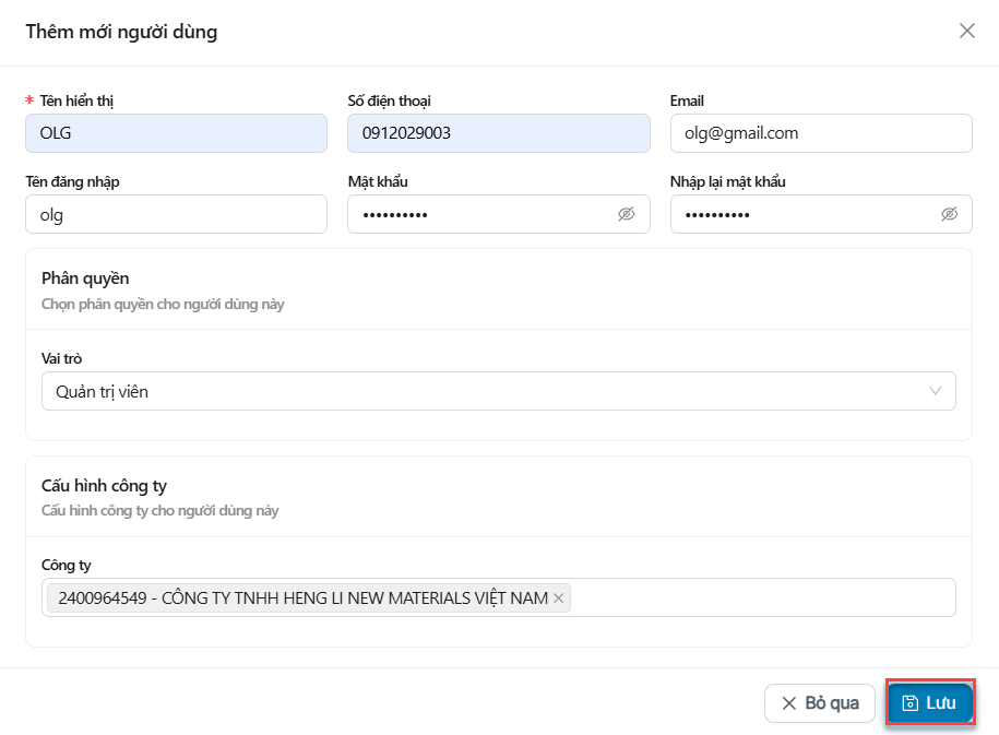Chức năng thêm mới người dùng giúp doanh nghiệp tạo tài khoản cho nhân sự tham gia sử dụng hệ thống, phân công đúng vai trò, quyền hạn và công ty phụ trách ngay từ đầu.